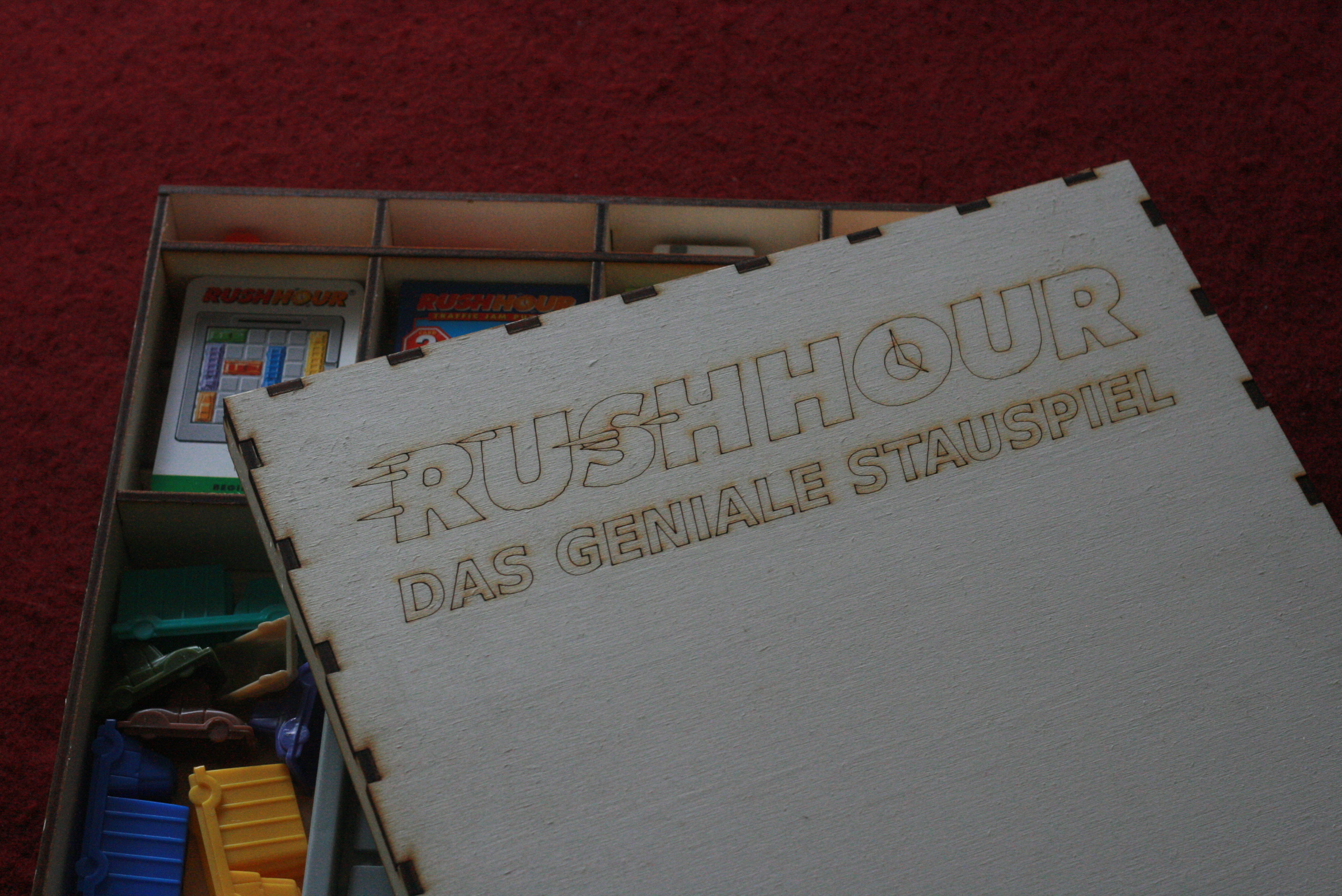 Eigentlich ist Rush Hour ein kleines Puzzle-Spiel, und mit der originalen Abdeckung lässt es sich gut im Schrank aufbewahren. Besitzt man aber auch die Erweiterungen — es gibt drei davon, jeweils ein Kartensatz mit einem extra-Auto — liegen die Sachen irgendwie verstreut.